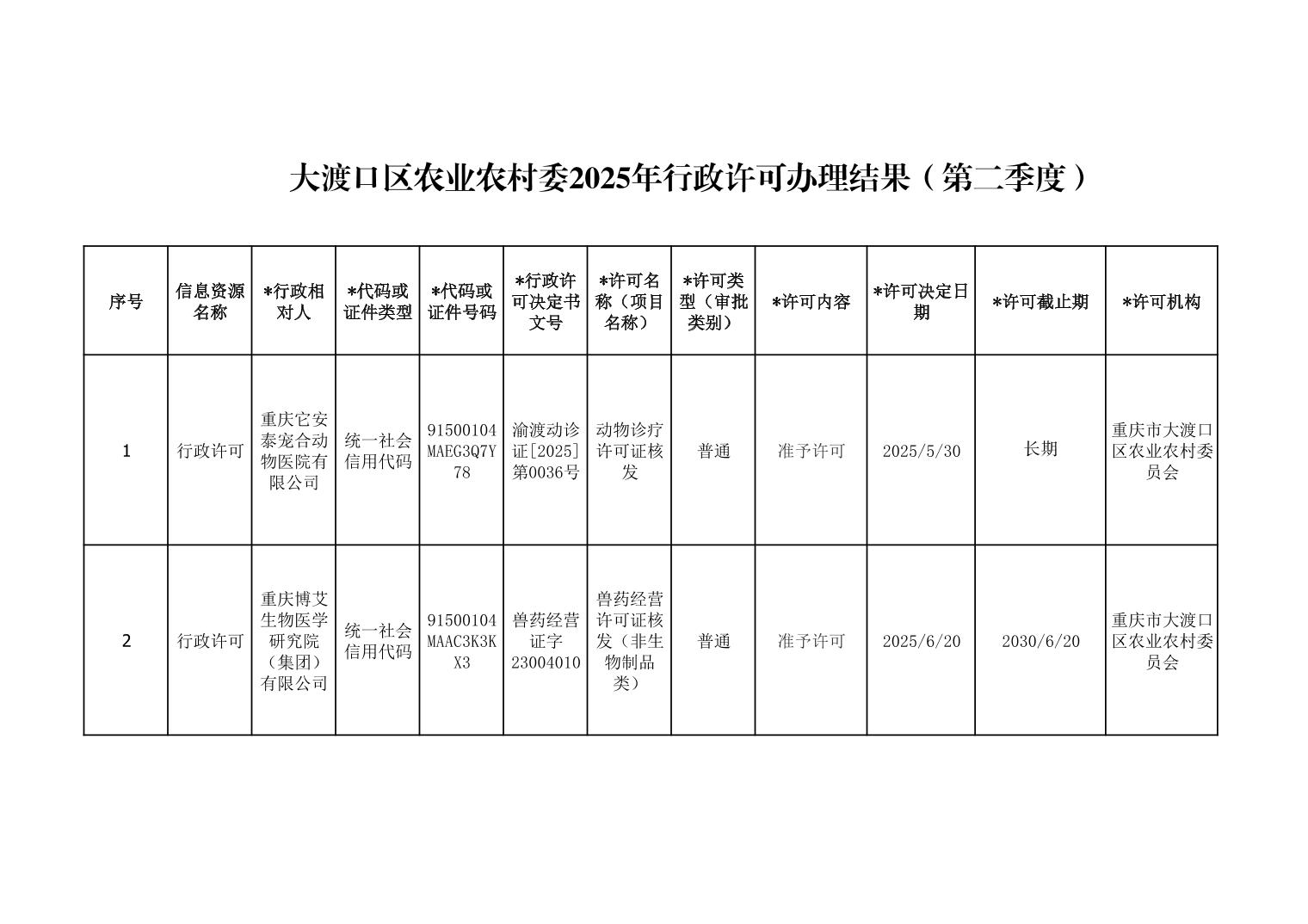 大渡口區(qū)農(nóng)業(yè)農(nóng)村委2025年行政許可辦理結(jié)果(第二季度)