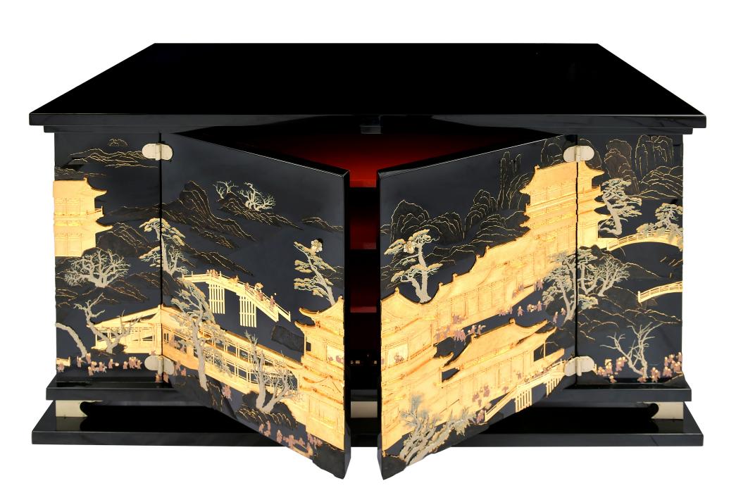 大漆作品:《黑地堆漆研繪點彩描金富貴歲朝圖邊柜》