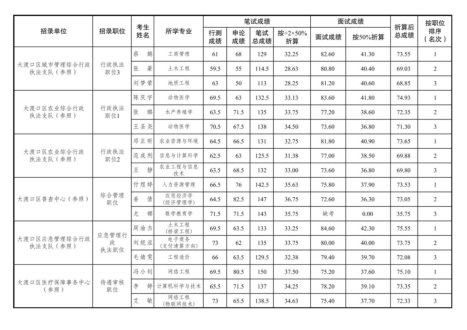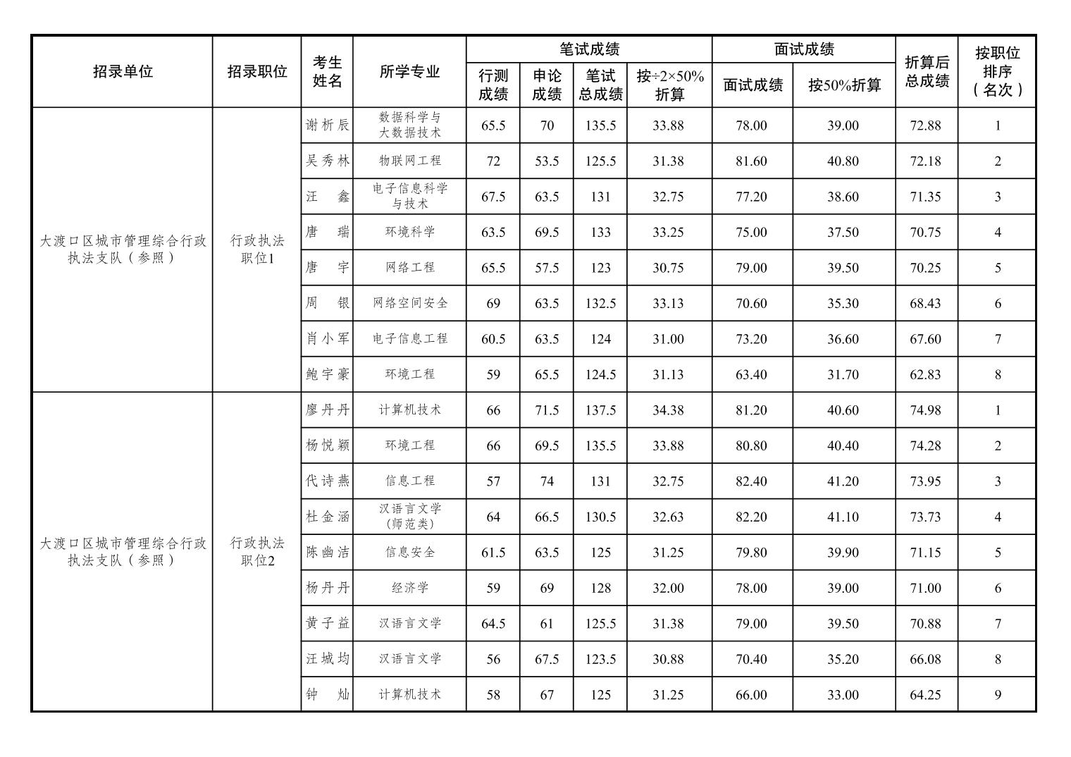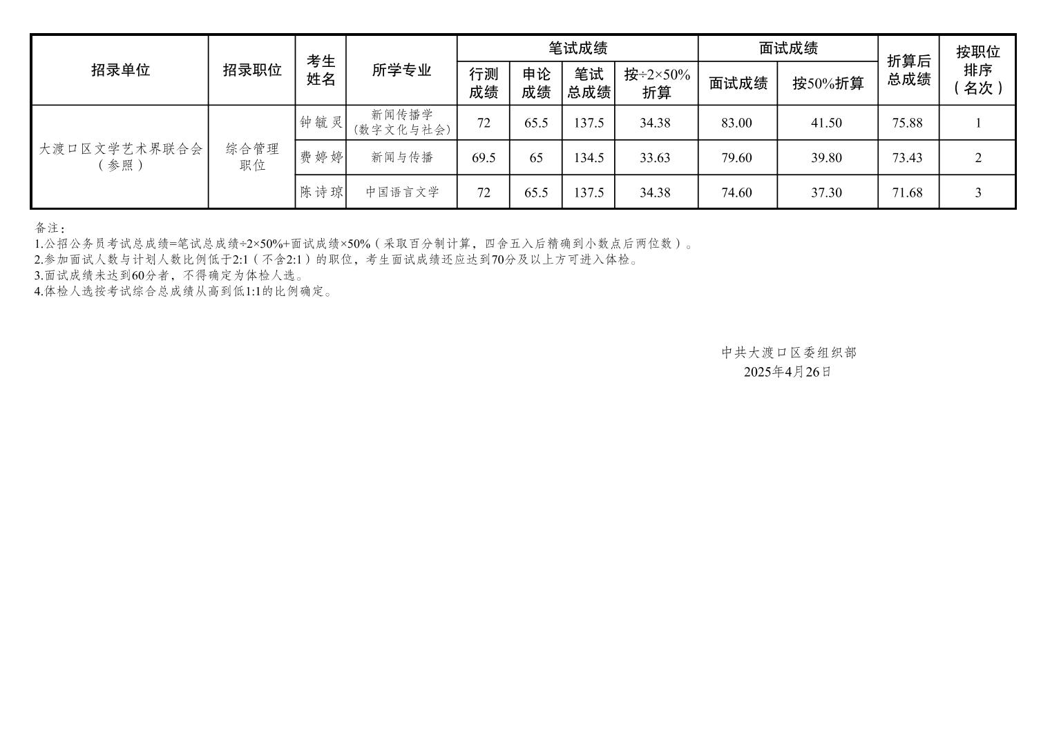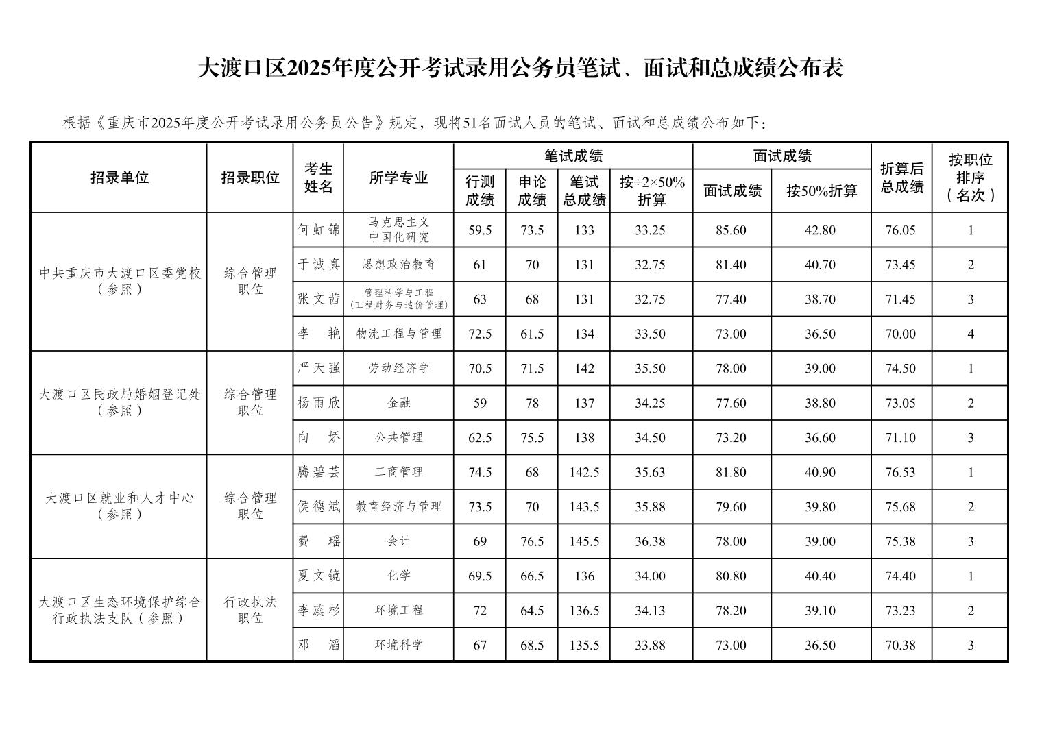 大渡口區(qū)2025年度公開(kāi)考試錄用公務(wù)員筆試、面試和總成績(jī)公布表