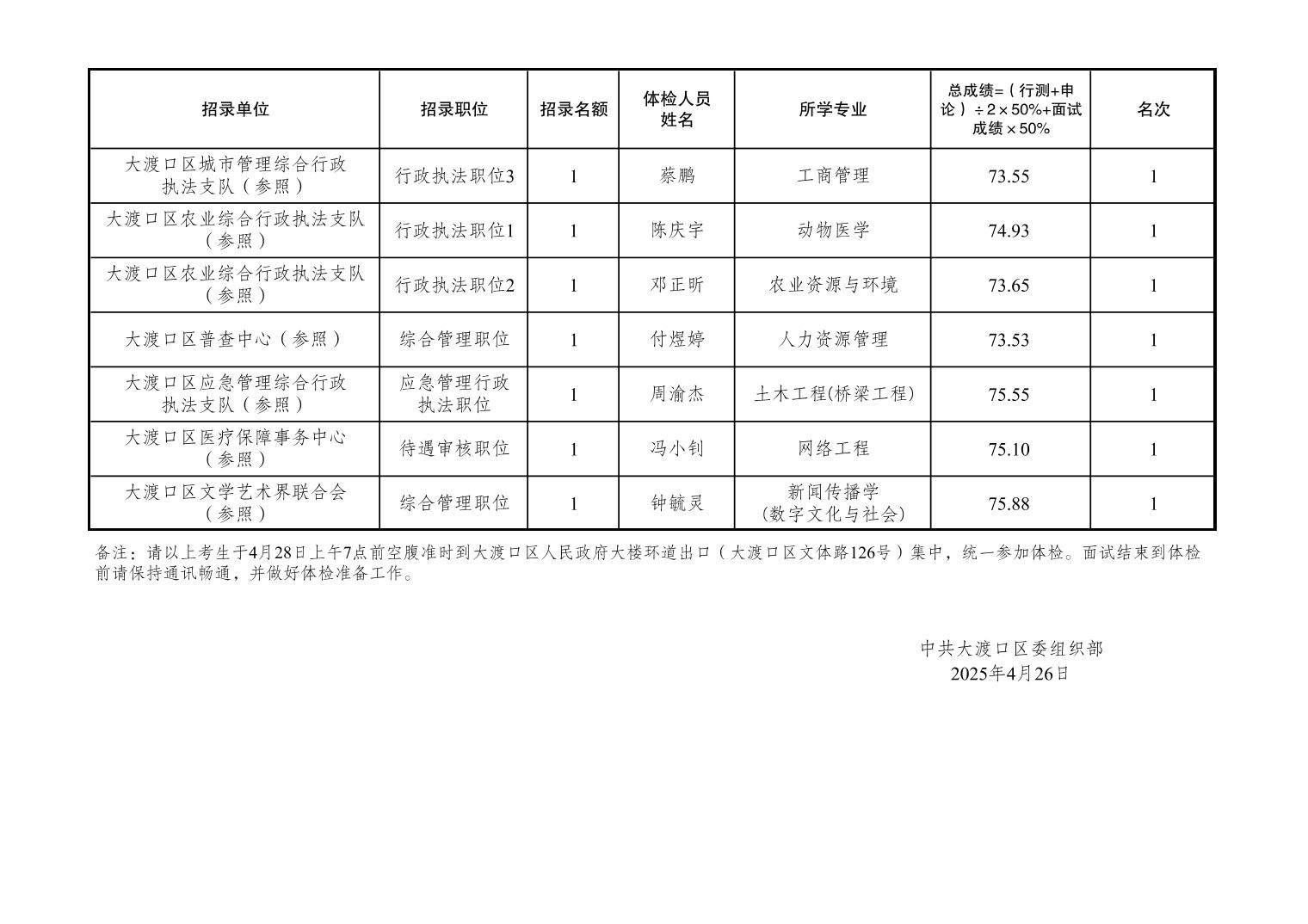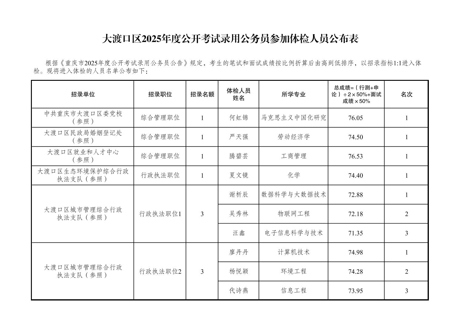大渡口區(qū)2025年度公開(kāi)考試錄用公務(wù)員參加體檢人員公布表